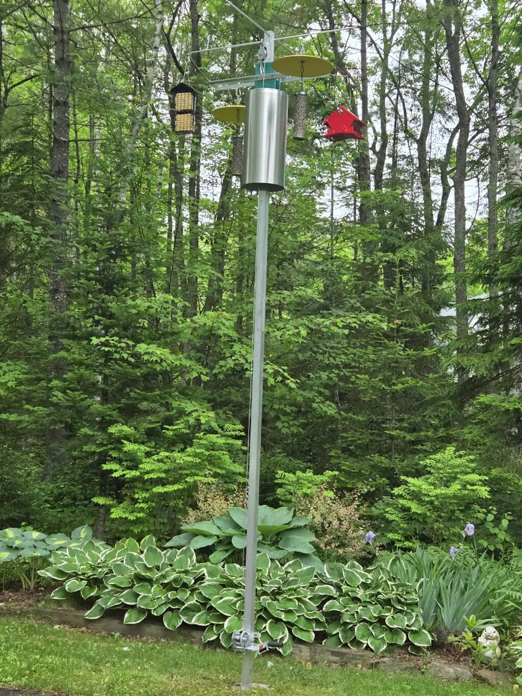 - 11" wide by 24" long aluminum squirrel/raccoon guard that attaches to the bottom of the polywood hub to keep other smaller, unwanted guests out of the feeders